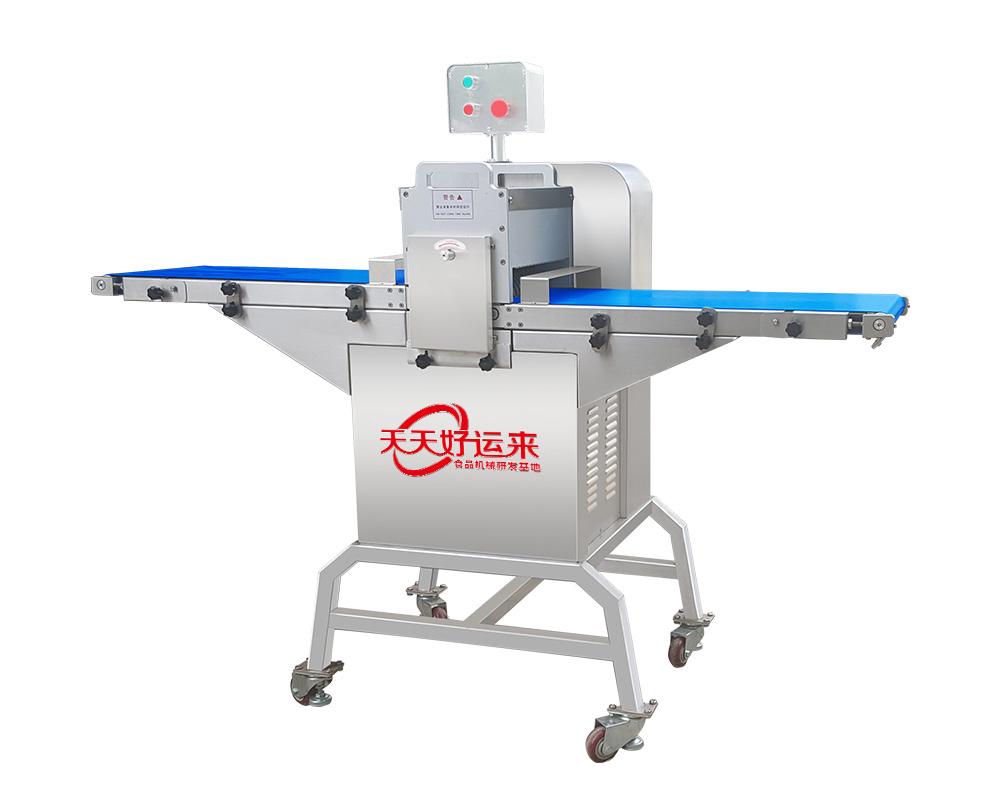 采用輸送帶進料、出料,切片厚度可按照用戶要求制作,可快速更換不同的刀組,滿足用戶各種規格的切片要求。能快速拆裝進、出料輸送帶及圓刀片組,整機采用防水設計,全不銹鋼制作,可直接用水沖洗機器。產品切割整齊,誤差非常小,方便操作,能實現產品快速包裝。標配尺寸25毫米;其它尺寸可定做。雞鴨禽類可帶骨切割為塊狀.